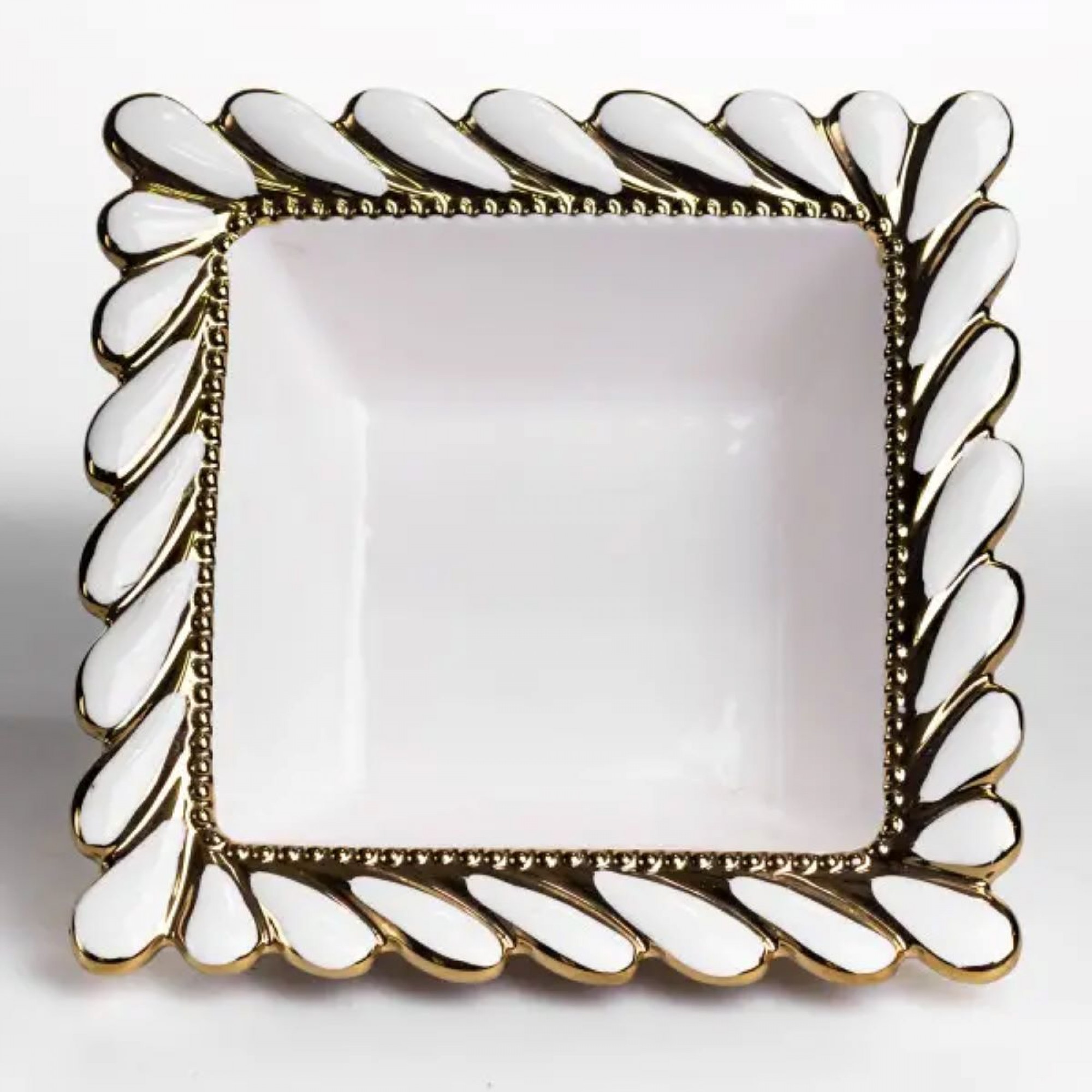 Глубокая квадратная тарелка Tiffany из фарфора привлекает внимание четкой геометрией и компактным форматом. Размер 26×26 см и высота 8 см делают ее удобной для порционной подачи блюд, где важна не только функциональность, но и аккуратный вид на столе. Тарелка подходит для ежедневного использования: в ней удобно подавать супы, салаты, гарниры или десерты. Благодаря глубине 8 см содержимое хорошо удерживается внутри, а квадратная форма помогает эффективно использовать пространство на столе или в сервировке. Вес 1.2 кг обеспечивает баланс между легкостью и стойкостью при использовании. Край тарелки оформлен рельефным узором в виде переплетенного каната по всему периметру. Контрастное сочетание светлой основы с золотистыми акцентами подчеркивает форму изделия и придает четкость контуру. Такой декор выглядит выразительно, но не перегружает общий вид, поэтому тарелка легко сочетается с разной посудой в сервировке. Характеристики: Материал: фарфор Форма: квадратная Размеры: 26 × 26 см Объем: 1.5 л Высота: 8 см Вес: 1.2 кг