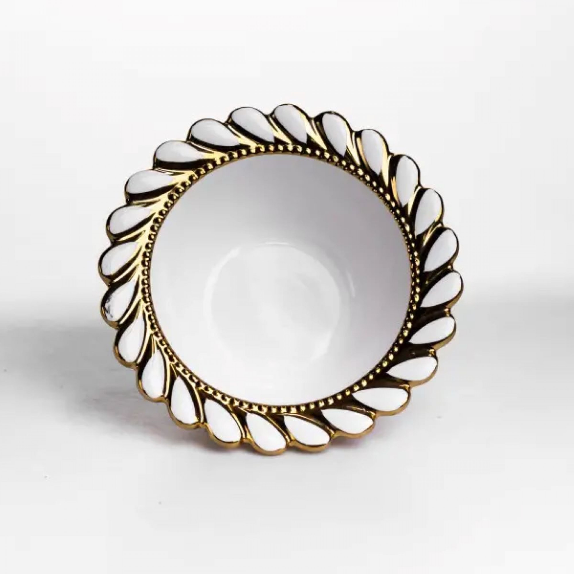 Глубокая фарфоровая тарелка Tiffany с диаметром 20 см подходит для подачи первых блюд, салатов и горячих блюд. Высота 7 см и объем 600 мл обеспечивают достаточную емкость для порционного использования, а классическая круглая форма удобна для ежедневной сервировки. Тарелка практична в использовании: оптимальный вес 500 г позволяет комфортно держать ее в руках, а глубина помогает избегать разлива жидких блюд. Фарфоровая основа хорошо подходит для регулярного использования дома или в заведениях питания. Край изделия украшен выразительным ажурным узором с прорезными элементами по кругу. Рельефный декор сочетает волнистые формы с аккуратной золотой окантовкой, которая проходит как по внешнему краю, так и по внутреннему ободку. Такой дизайн создает четкий акцент на форме тарелки и добавляет ей заметности в сервировке без чрезмерной декоративности. Характеристики: Материал: фарфор Форма: кругла Диаметр: 20 см Высота: 7 см Объем: 600 мл Вес: 500 г