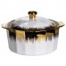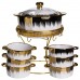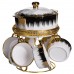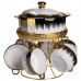 Суповий сервіз із високоякісної порцеляни стане прикрасою будь-якого столу та додасть сервіруванню нотку вишуканості. Елегантне поєднання білого кольору із золотими та чорними акцентами робить набір особливо ошатним і сучасним. До комплекту входить супниця з кришкою та шість супових тарілок, на міцній металевій підставці із золотим покриттям. Завдяки зручній формі та продуманому дизайну сервіз не тільки красивий, але й практичний у використанні. Основні характеристики супового сервізу: Матеріал: порцеляна + метал; Розмір: 25×25×32 см; Обсяг супиці: 2 літри; Об'єм тарілок: 300 мл; Діаметр супниці: 20.5 см. Такий набір прекрасно підійде для сімейних обідів, святкових вечер або урочистих заходів. Він стане чудовим подарунком на весілля, новосілля або ювілей, підкреслюючи смак і увагу до деталей господарів будинку.